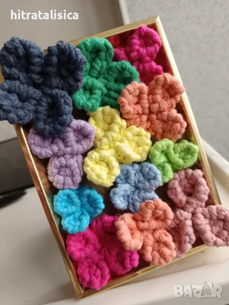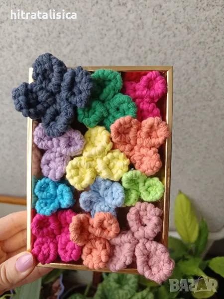 Малка декорация ,,Цветна градина,, съдържа 12бр цветя с 3 и 4 листа. Изработени от макраме