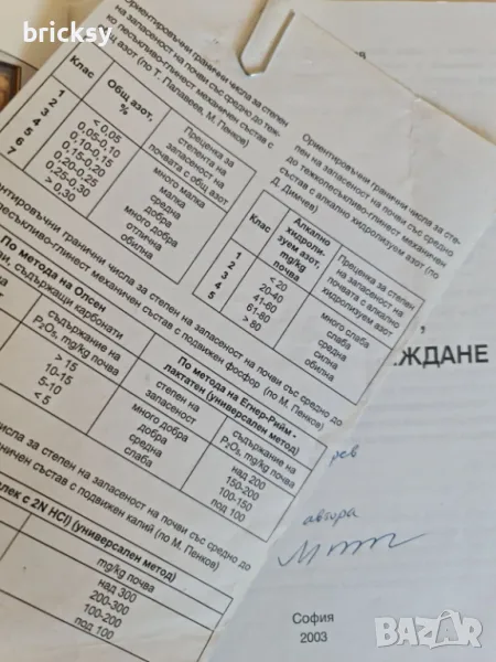 Рядко издание "Избор на място създаване и отглеждане на лозя" от професор Марин Пенков. Книгата има дарителски надпис от автора, както и прикачен към нея лист с параметри на запасеност на почвите. 2003г. меки корици, 252 стр.