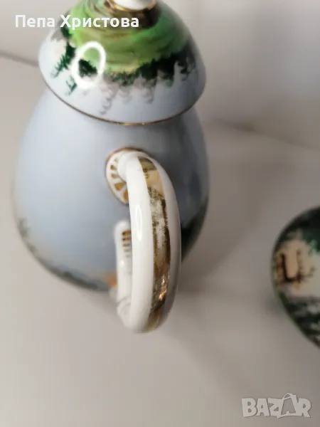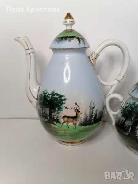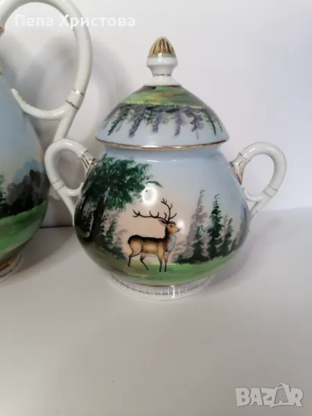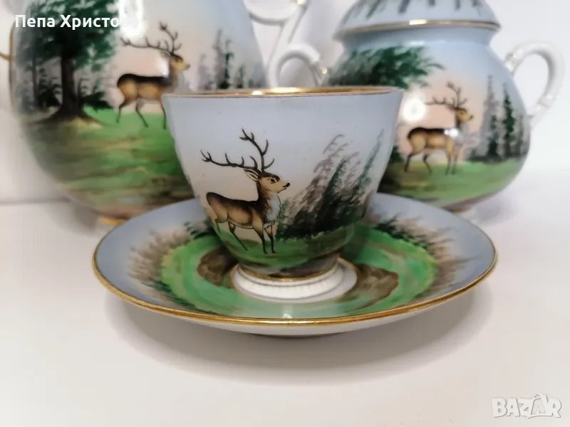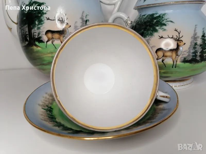 Антикварен сервиз за чай за един човек от бохемски порцелан, израбтен около 1850г. с ръчно изрисувани ловни мотиви. Картините са изключително детайлни и цветни.
