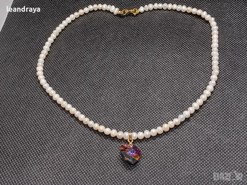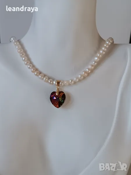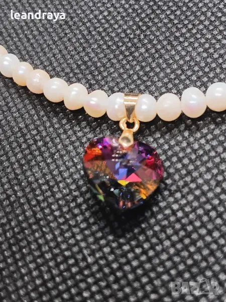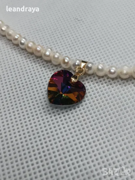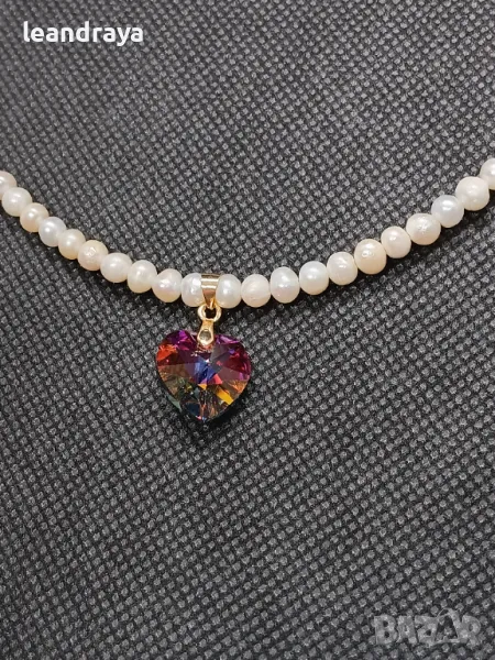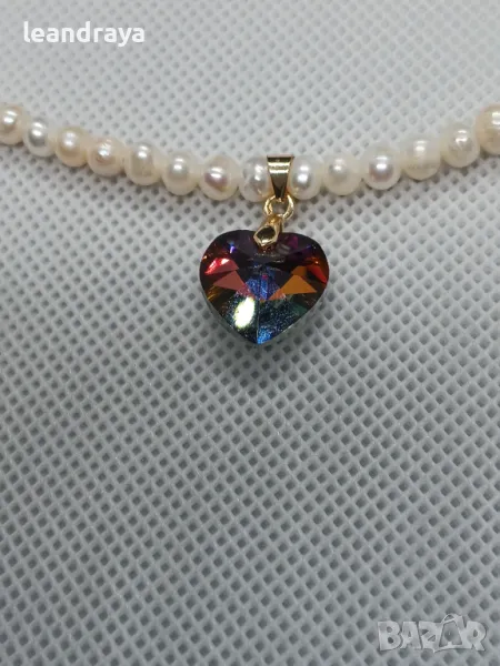 Късо колие с естествени перли 5 мм, многоцветно сърце кристал Сваровски 15 мм. Елементите са с позлата. Дължина на перлите 40 см и 2.5 см. на компоненти със закопчалка. Дължината може да бъде променена.