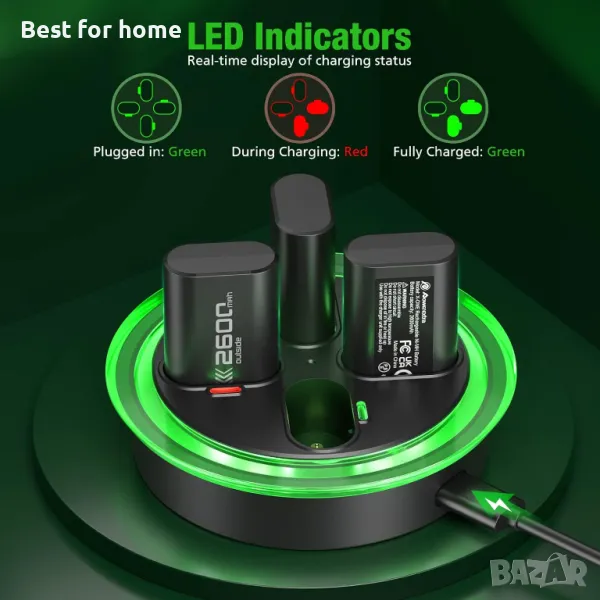 🔋【Уникален дизайн на LED индикатор】: Зарядното устройство за батерии Xbox one има ясна LED индикация за състоянието на зареждане, при зареждане индикаторът ще се промени в червено. Когато е напълно зареден, индикаторът ще се промени в зелено.