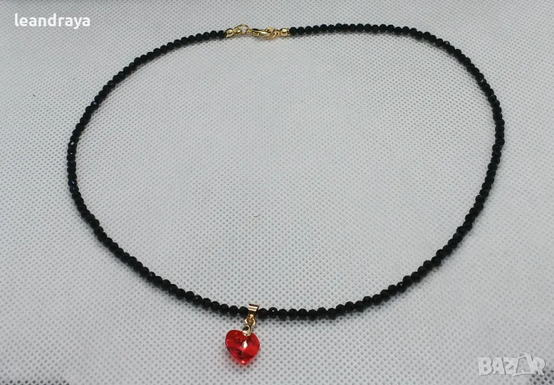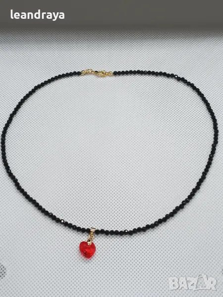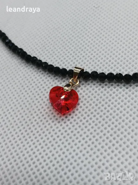 Колие от черен турмалин 3мм и червено сърце кристал Сваровски 10 мм. Елементите са с позлата. Дължина на турмалина 40 см. и 2.5 см компоненти със закопчалка. Дължината може да бъде променена.
