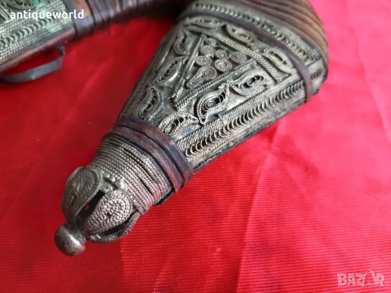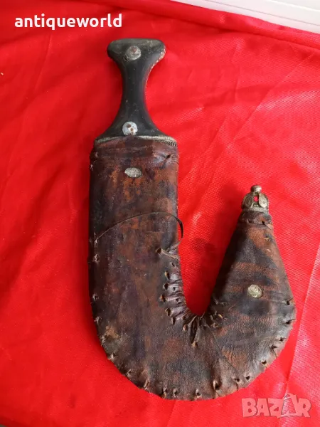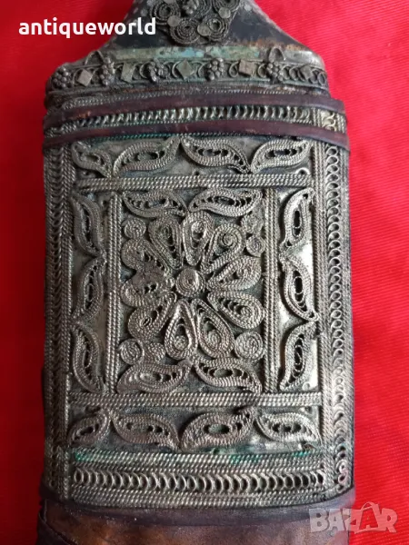 Стар Йеменски ХАНДЖАР , Кинджал Кама , Острие.Дръжка от Кост На НОСОРОГ, Кания от дърво Обвита с Кожа с Богата Филигранна Украса Сребро( Сачан, ниска проба ).Маркировка на Гърба на Канията от Майстора.