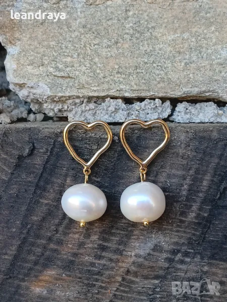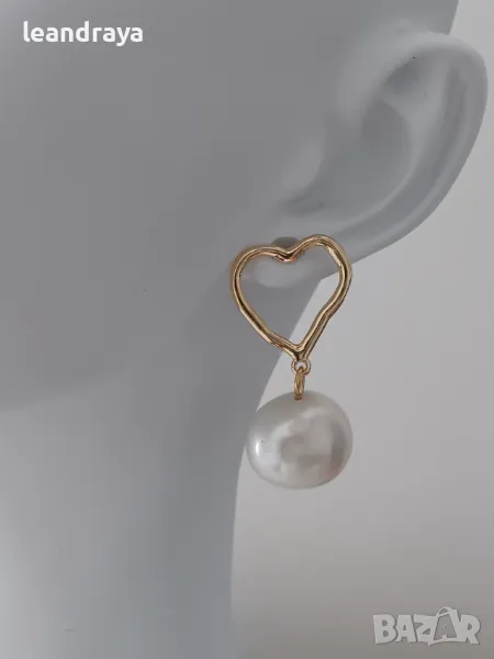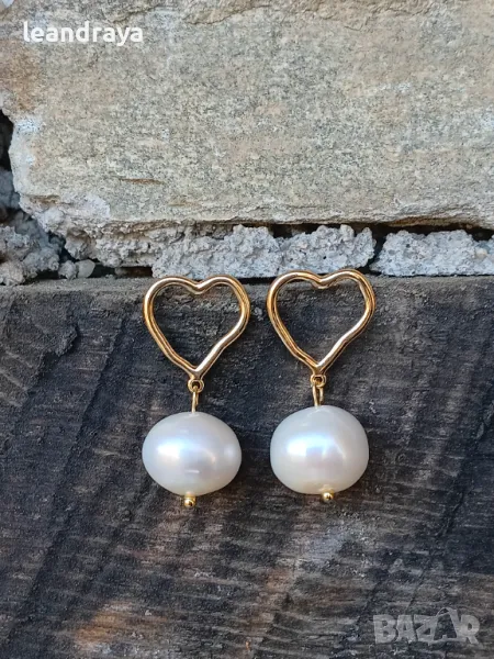 Уникални обеци големи 13-14 мм речни висококачествени перли. Позлатено сърце и два комплекта тапички: обикновени и перла за арт визия.