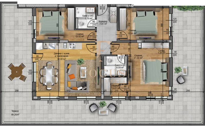 Апартаментът е четиристаен с обща площ от 145,15 кв.м. и има следното разпределение: антре, дневна с кухненски бокс, три спални, две бани с тоалетни и гардеробна. Към имота има тераса - 89,26 кв.м.