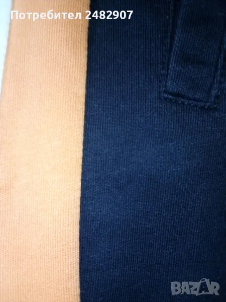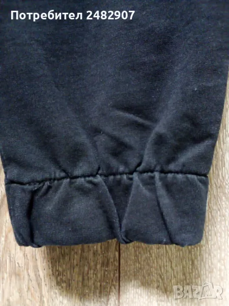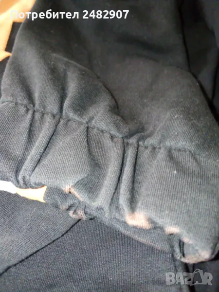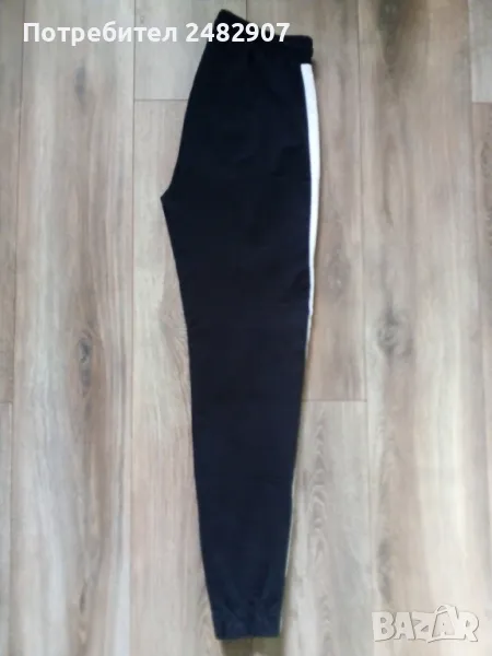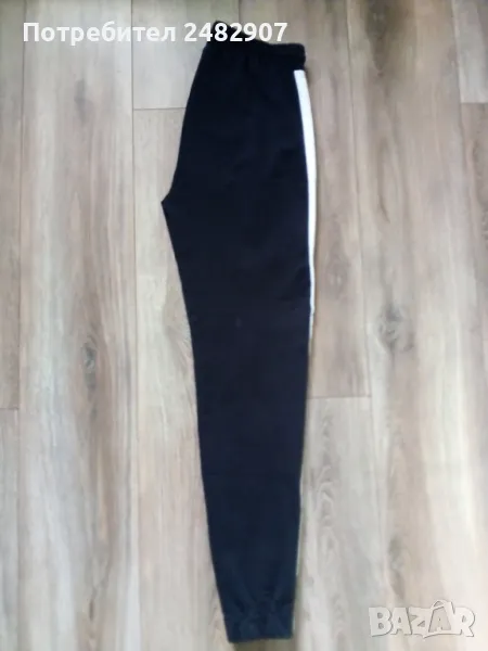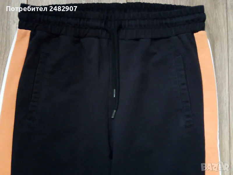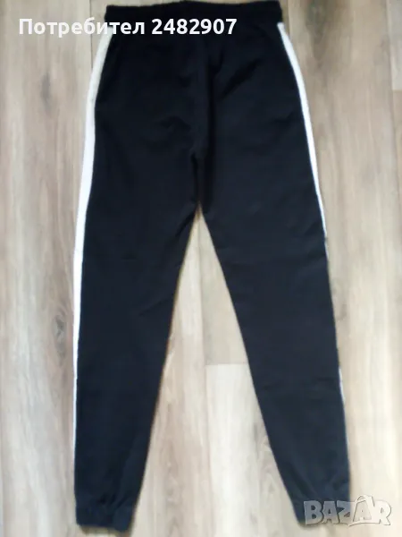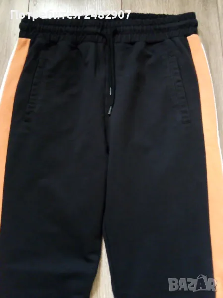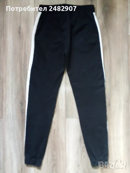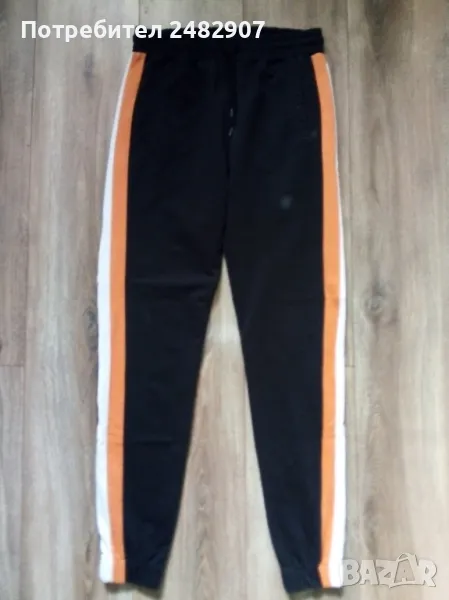 Дамско памучно спортно долнище в черно, оранжево и бяло, размер S. Ширина в талията - 35 см, дължина от талията до чатала - 29 см, дължина от талията до долу - 100 см, ширина на крачола в долната част - 10 см. Много запазено, почти не е използвано, с ластик и връзки в талията, два джоба и ластик в долната част на крачолите.
