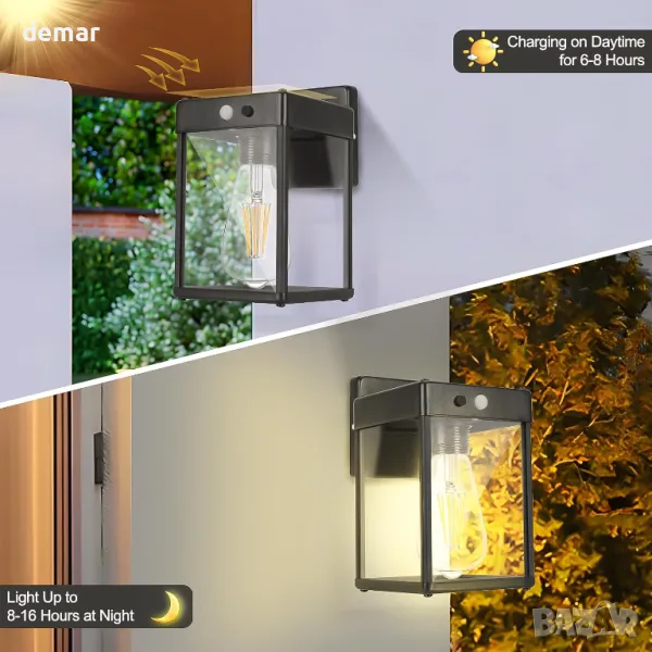 Изработена от здрав алуминий с абажур от закалено стъкло, тази соларна стенна лампа е устойчива на атмосферни влияния и подобрява прозрачността на светлината. Той разполага със сменяема LED крушка E27, позволяваща персонализиране с различни цветови температури. Сензорът за движение предлага три режима на осветяване: пълна яркост с режим на затъмняване, пълна яркост с автоматично изключване или постоянна средна яркост. Високоефективен слънчев панел и акумулаторна батерия осигуряват над 10 часа осветление след 6-8 часа зареждане. Водоустойчивостта му IP65 гарантира издръжливост при всякакви метеорологични условия. С винтидж черно покритие, той подхожда на различни външни пространства, включително веранди, вътрешни дворове, гаражи и входове.