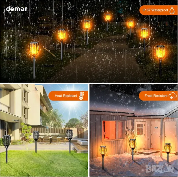 Тези 96-LED соларни фенери се отличават с ярки трептящи пламъци, добавящи декоративен щрих към вътрешни дворове, градини, веранди, дворове и пътеки. Изработени от водоустойчив ABS материал, те издържат на дъжд, сняг, слънце и замръзване. Високоефективните слънчеви панели осигуряват 8-10 часа осветление през лятото и 5-7 часа през зимата, с функция за автоматично включване/изключване, която се активира при здрач и се изключва на зазоряване. Множество режими на осветление, включително ярък, трептящ пламък и затъмняване, осигуряват персонализирана атмосфера. Монтажът е прост - просто свържете компонентите и ги поставете под пряка слънчева светлина, не са необходими инструменти.