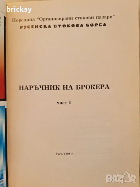 Много рядко и запазено издание - Наръчник на брокера. Част 1 Камелия Парчик, Милен Горанов. Издателство Държавен архив, 1998г, меки корици и стр. 213. Бонус към покупката запазено издание на софийската стокова борса, съдържащ борсов и други правилници. Единствено издание на български език по темата.