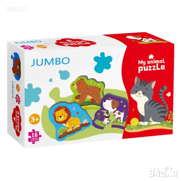 Бебешки пъзел с 16 големи части, които образуват 4 картини 16x16 см с котка, куче, мечка и лъв.