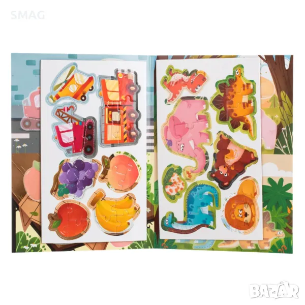 Пъзел игра с магнитни части. Детето ще оформя картините с различни теми, с 10, 12, 13 и 14 части. След това може да ги върнете на мястото им до следващата игра на детето.