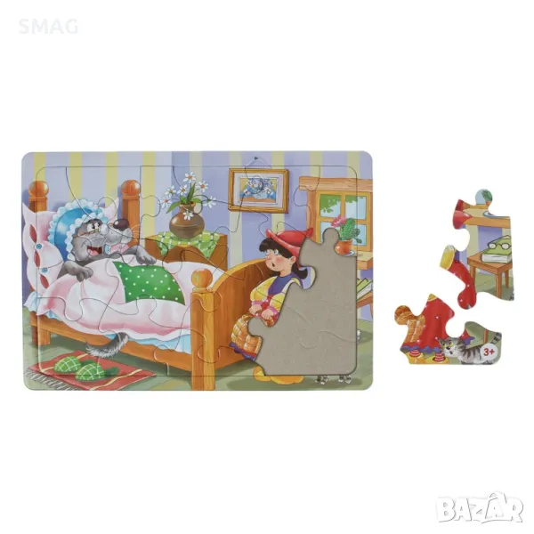 Детски пъзел с изображение на Червената шапчица и вълка, облечен като баба.