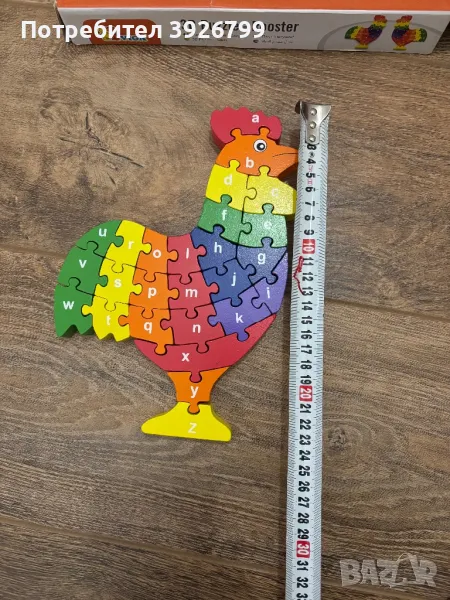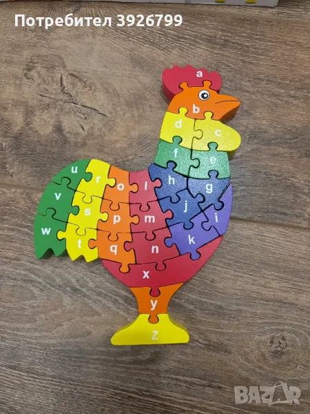 3D дървен пъзел петел. С азбуката на английски език- от едната страна са малки буквите, а от другата големи