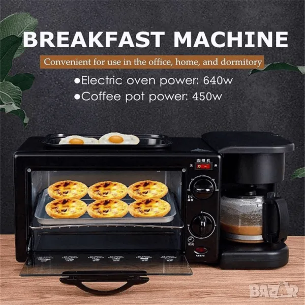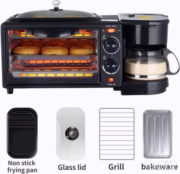 Breakfast Maker 3 в 1 е комбиниран уред - електрическа машина за закуска, печене на скара, кафемашина, тостер, плюс горен тиган с незалепващо покритие и стъклен капак.
