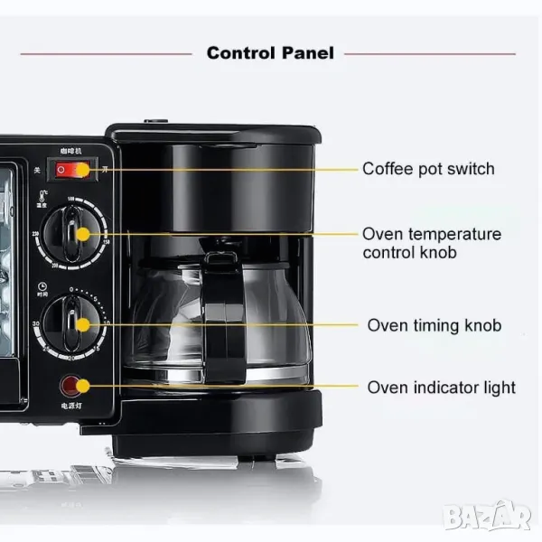Тази станция за закуска е изработена от висококачествен метал, което я прави здрава и издръжлива. Спестяващият място дизайн 3-в-1 е перфектен за малки кухни, апартаменти, общежития, кемпери/домакини и т.н. Има копче за термостат, копче за таймер и ключ за захранване. Можете да печете на скара, да препичате/печете, да затопляте/затопляте вашата храна или напитка, светлинният индикатор ще ви уведоми, когато уредът е включен.