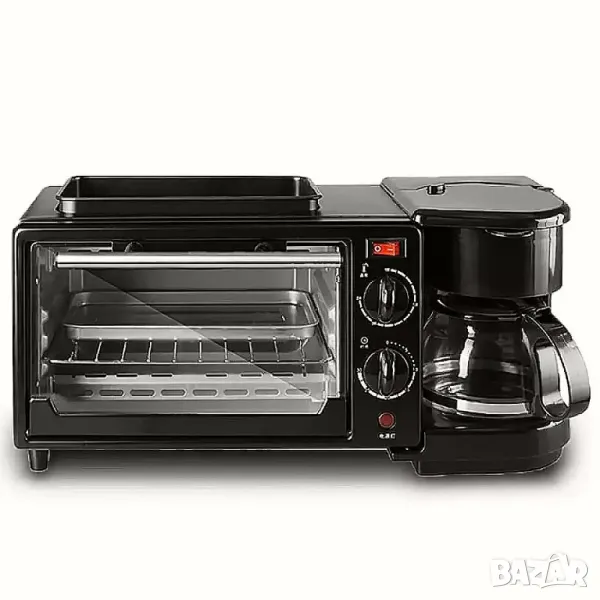 Истинско откритие, което ще се впише перфектно в интериора на всяка кухня. Предложението ни произвежда кафе за до 4 човека, изпича 4 филийки хляб и едновременно с това ви позволява да печете всичко, което пожелаете, във фурната. Бързо, лесно и удобно – спестете време, докато пържите яйца, препичате хляб и правите кафе едновременно! Не бягайте напред-назад в кухнята, чудейки се кой от уредите да включите или изключите най-напред, защото вече имате всичко заедно. Печката, тостер и кафемашина 3 в 1 е подходяща за малки кухни, общежития, кемпери и др.