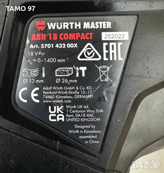 Марка и модел: Wurth ABH 18 Compact Напрежение на мотора: 18V