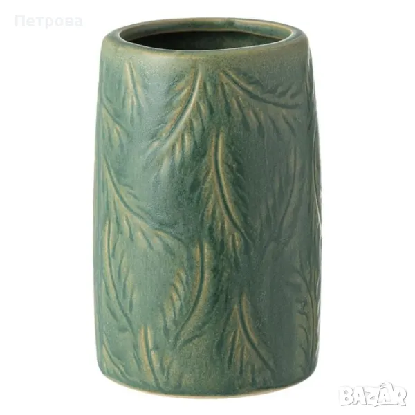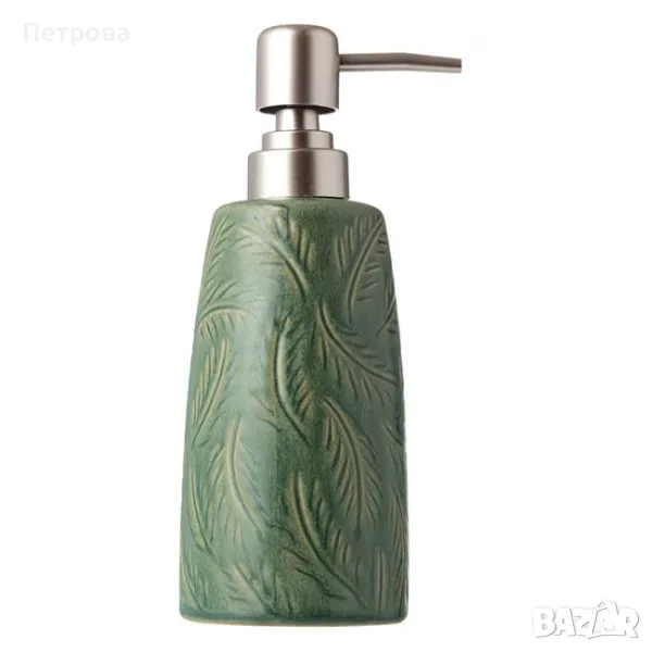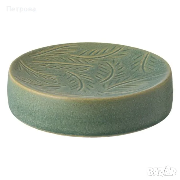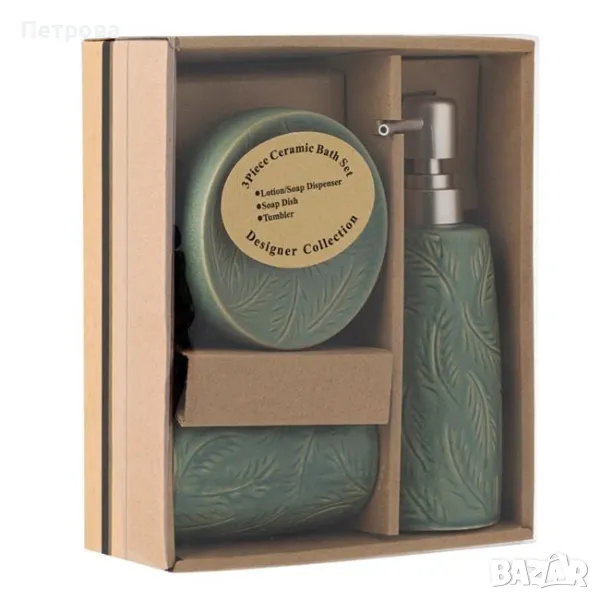 Керамичен комплект за баня , в цвят мента с релефен дизайн на листа. Опаковката съдържа диспенсер за течен сапун,чаша и сапунерка.