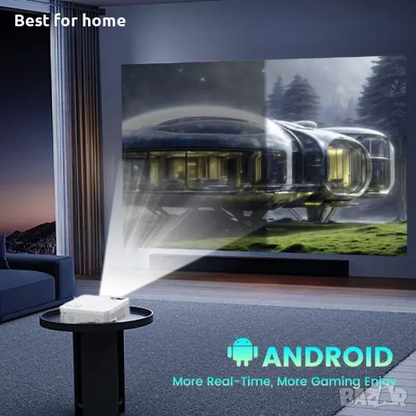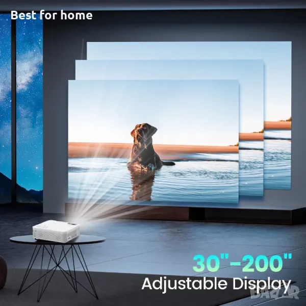 мини проектор предлага по-бърза, гладка и по-стабилна връзка. Поддържа проекция на Apple/Android чрез едно и също приложение за прожектиране под същия WIFI (приложението трябва да бъде инсталирано от вас), за да можете лесно да прожектирате любимия си филм на голям дисплей.