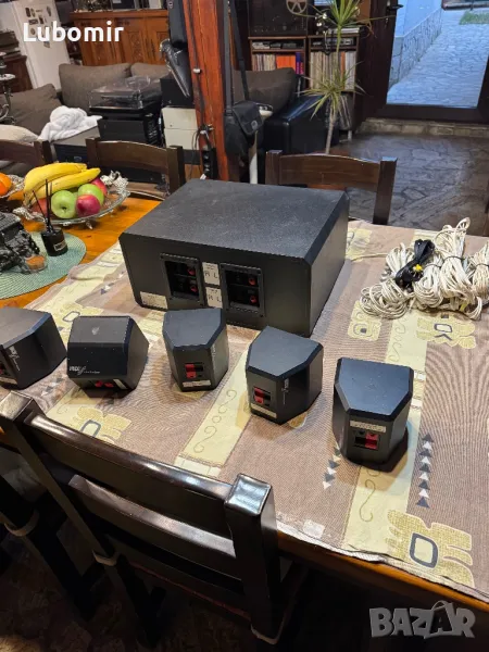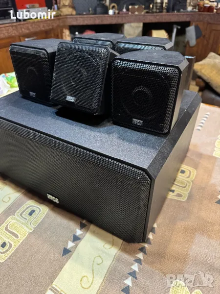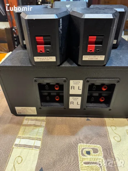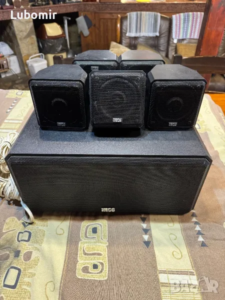 Субуфер и пет двулентови тежки и масивни тонколонки на немската фирма HECO модела е SPACE S1 в много добро работещо състояние,бонус кабелите към тях!!