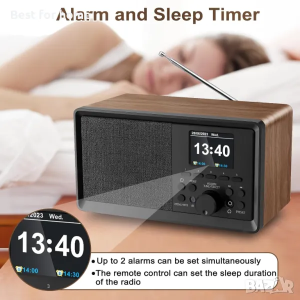 Можете да зададете 2 аларми едновременно. Функция таймер за заспиване: Можете да зададете времето за заспиване на радиото в режим на готовност, има общо 8 нива на време.