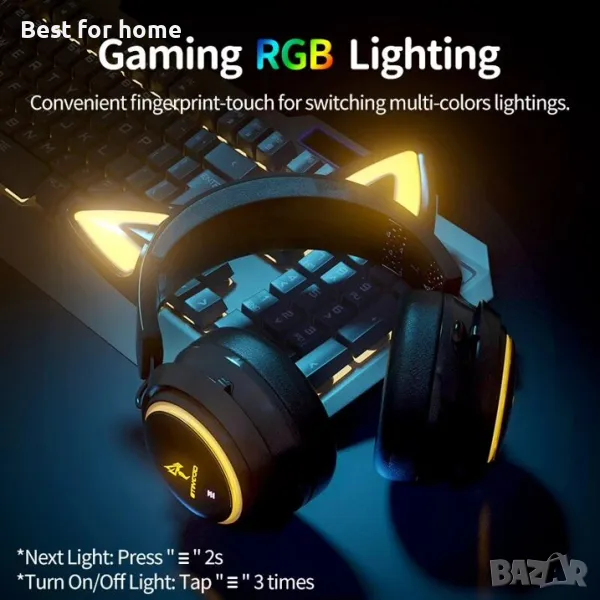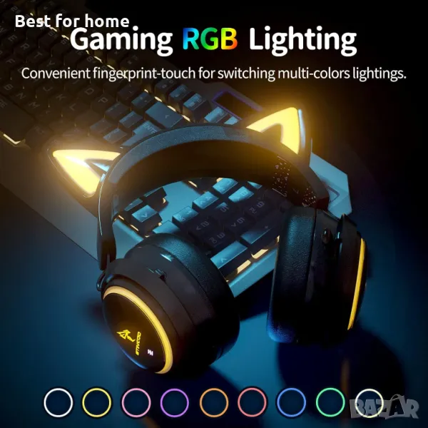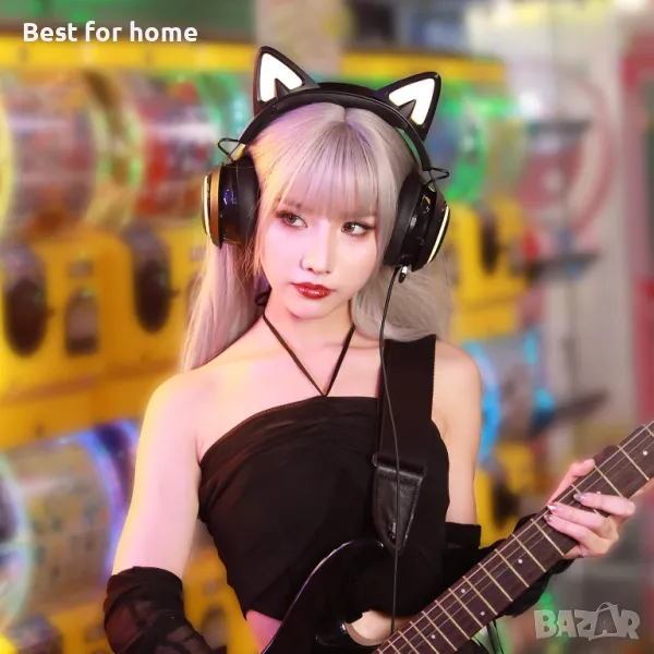 Слушалки за игри, 8 цветни светлинни ефекти, украса за котешки уши, 6 мм микрофон, кабелни слушалки за ежедневна употреба
