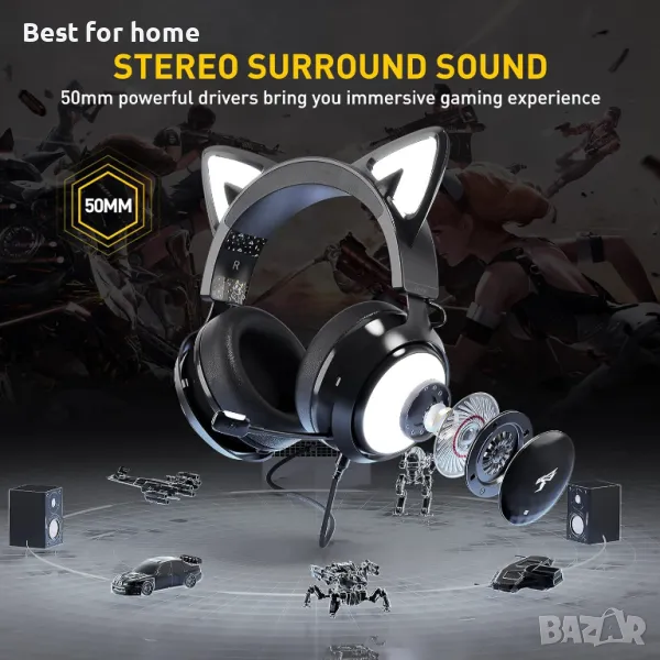 【Стерео заобикалящ звук】Проектирани с голям 50 мм драйвер и стерео съраунд звукова система, SOMIC GS510 кабелни слушалки с котешки уши ви осигуряват превъзходно качество на звука и реалистично игрово изживяване. Идеална идея за подарък за момичета и момчета.