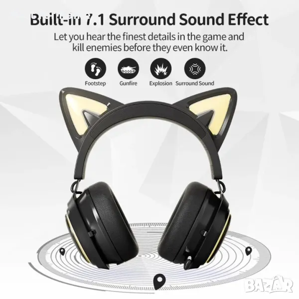 Слушалките SOMIC GS510 2.4G се предлагат в 3 цвята, черните слушалки са толкова готини. Светещ дизайн на котешко ухо с различни цветове LED мигаща светлина, много очарователна. Слушалките имат два режима: безжичен режим и кабелен режим. Можете да превключвате режима според вашите различни изисквания. 7.1 стерео звук и 3 професионални звукови режима - Игри/Аудио/На живо, които могат лесно да изпитат различни професионални звукови ефекти. микрофонът за намаляване на шума прави обаждането по-ясно. Тези слушалки за момичета жени възрастни ви позволяват да се потопите в игри и музика. Най-добрите подаръци за рожден ден или Коледа за момчета и момичета, деца, тийнейджъри, възрастни и любители на котки.