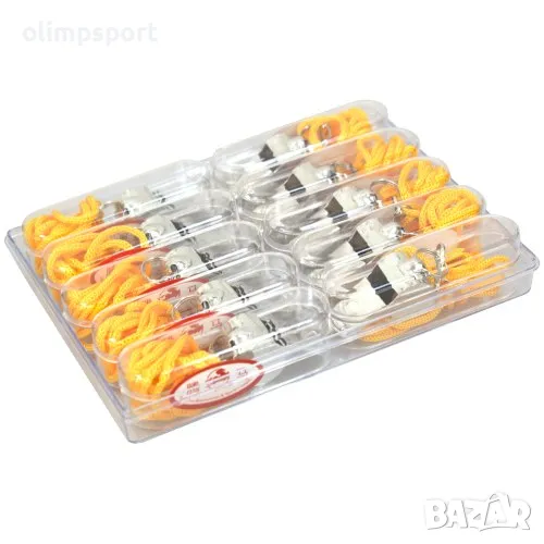Свирка реферска (съдийска) MAXI, Метална, С топче. Подходяща за тренировки и мачове в различни спортове. Свирката е с халка и въже за окачване на врата. Комплектът съдържа индивидуална кутия за удобно съхранение и пренасяне на свирката. Тегло за 1 свирка - 12 г. Материал - метал. Брой свирки в кутия - 10. Тегло за кутия от 10 свирки - 300 г. Размери кутия от 10 свирки - 18х13х3 см. Цената е за една свирка.