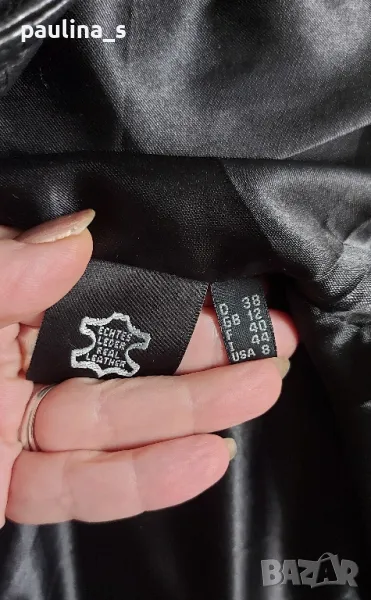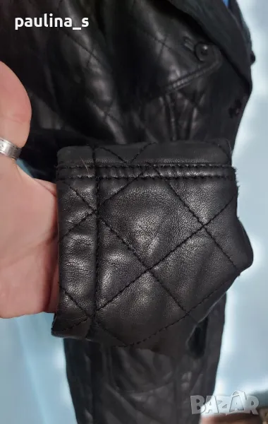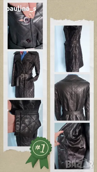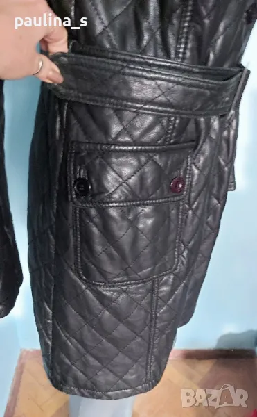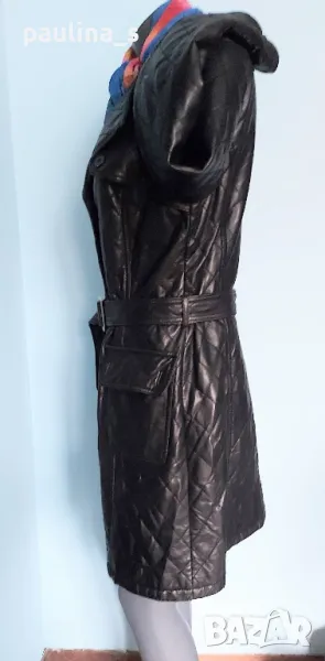 Кожата е много мека и качествена, вратата, вшита в нея топли, хастарът е от памучен сатен(има леки следи от употреба). Копчетата са брандирани, джобовете са външни. Дрехата е много красива и ефектна. Реставрирани са илиците и колана, перфектна, във вид видим от снимките. Няма дефекти, само ефекти!