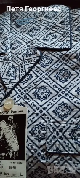 Нова елегантна мъжка пижама 100 % памук. Размер L: рамо - рамо 48 см, гръдна обиколка 108 см, дължина 78 см. Панталон - обиколка на ханша 110 см, дължина 106 см. Красиви тъмно сини шарки на бял фон.