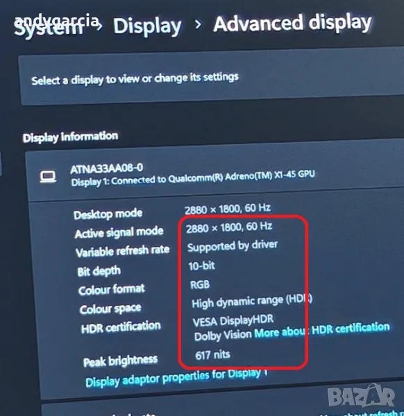OLED Touch 3K резолюция (2880 x 1800) 16:10, 0.2ms, яркост 617 нита засечени от Windows HDR peak, 100% DCI-P3 цветово покритие, контраст 1,000,000:1, VESA CERTIFIED, пълна поддръжка на HDR и 1.07 милиард цвята.