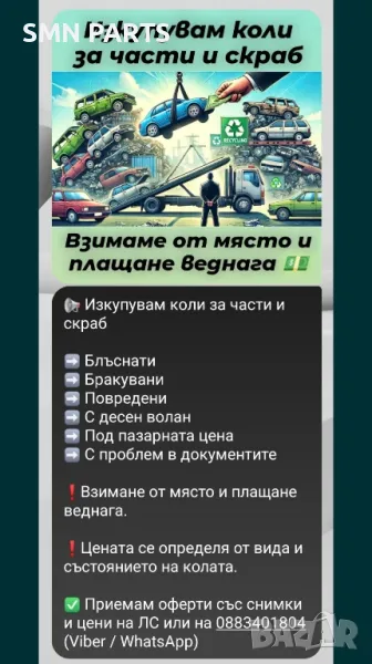 Изкупувам и продавам коли за части и скраб → Обява 49036535