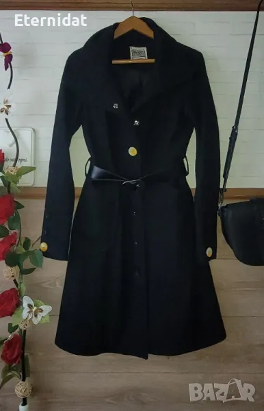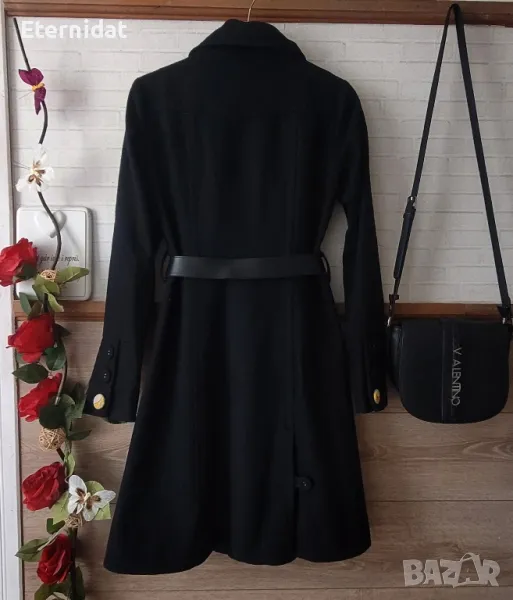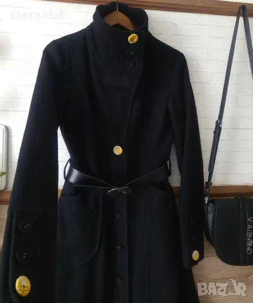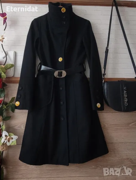 Черно палто вълна на марката OBJECT. Втален модел с опция за коланче в талията. Два големи предни джоба. Красиви копчета облечени в слънчев цвят за повече шик на визията! Леко разкроен модел. Опция високо закопчаване при яката. Материята 80% вълна. Размер по етикет XS ,но отговаря на S.Цена 120лв