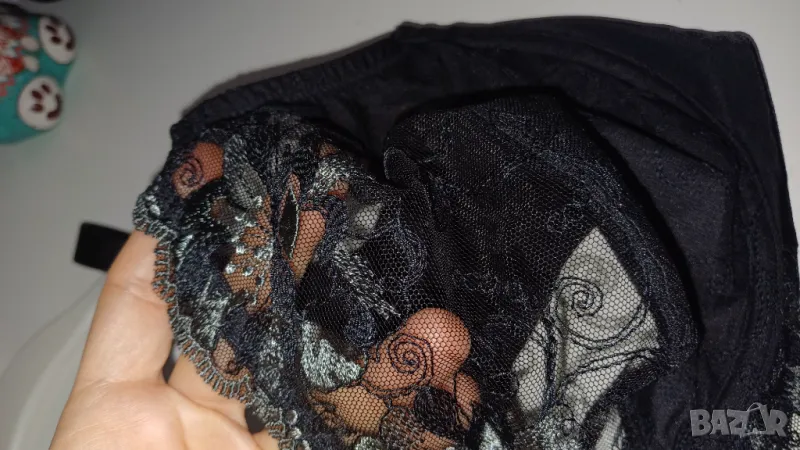 Triumph 85 E. Без забележки. Има банели. Черен със сиви цветя по дантелата.