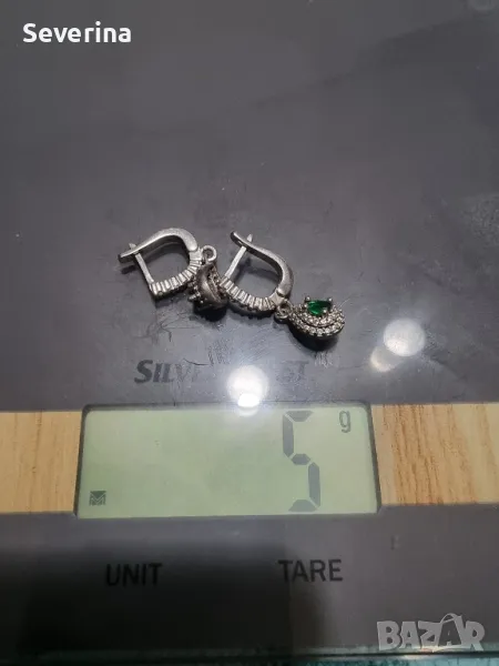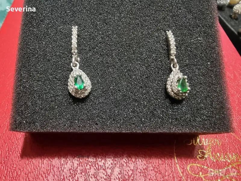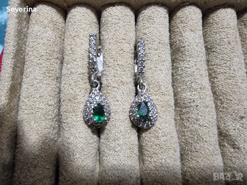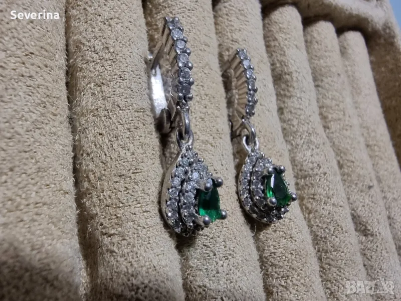 Нови,изящни, сребърни обеци,обсипани с малки цирконий и зелен камък в средата, страхотно стоят,английско, стабилно закопчаване!