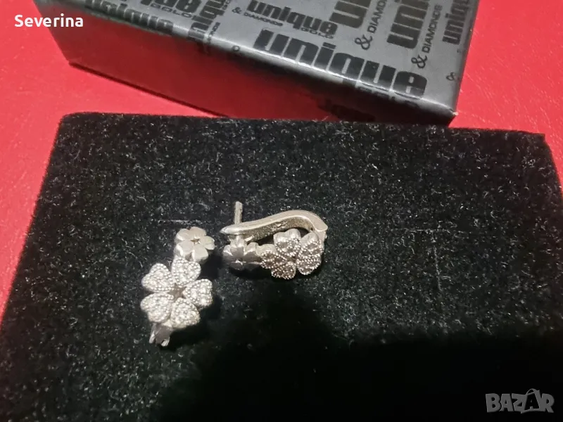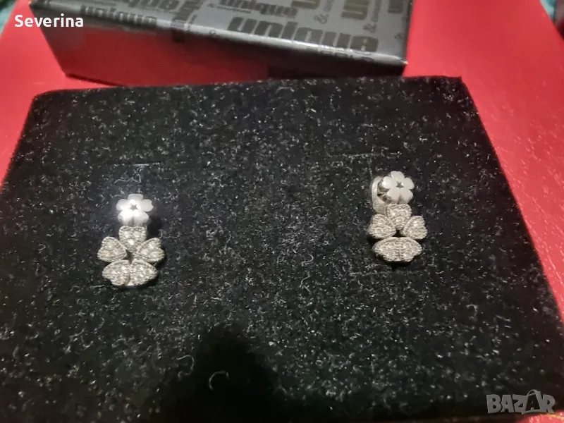 Нежни, сребърни, детски обеци с голяма детелина с цирконий и малка отгоре,английско закопчаване!Носени кратко!