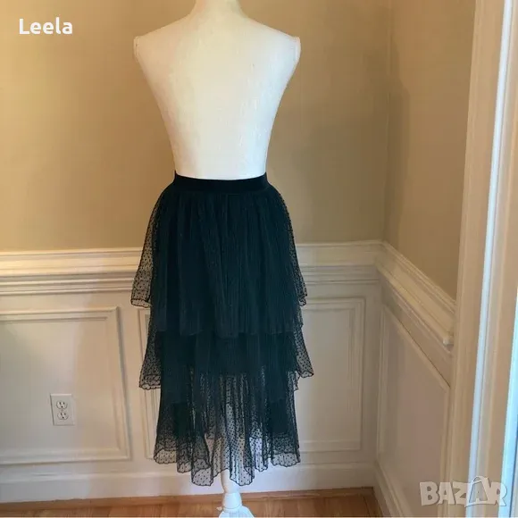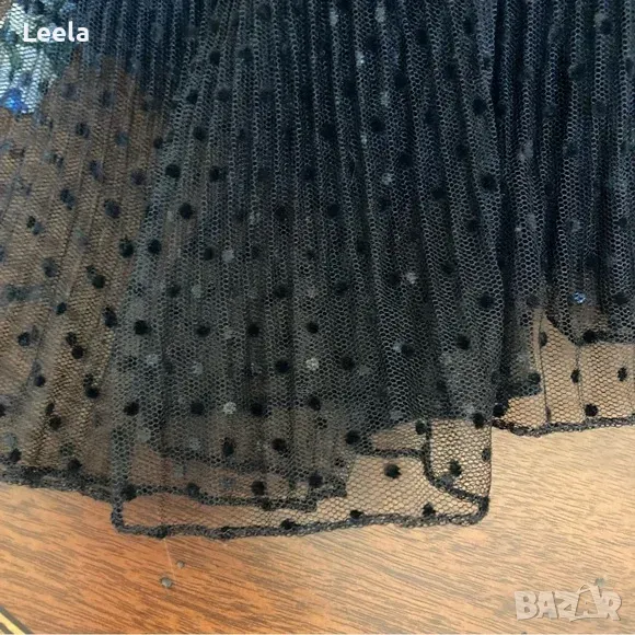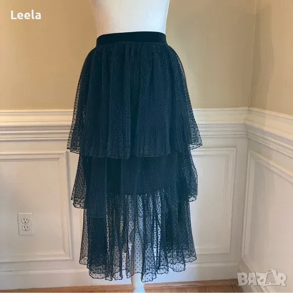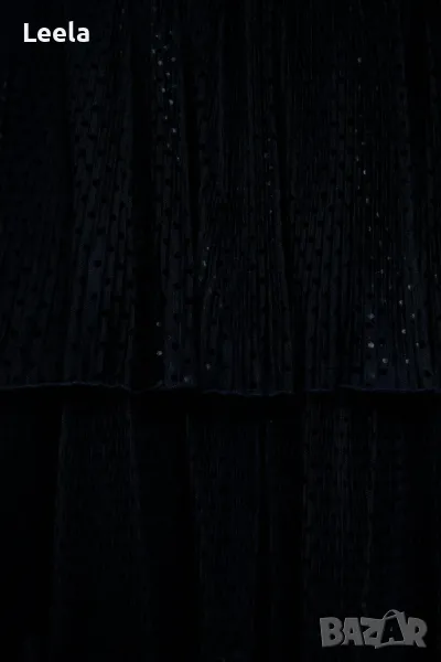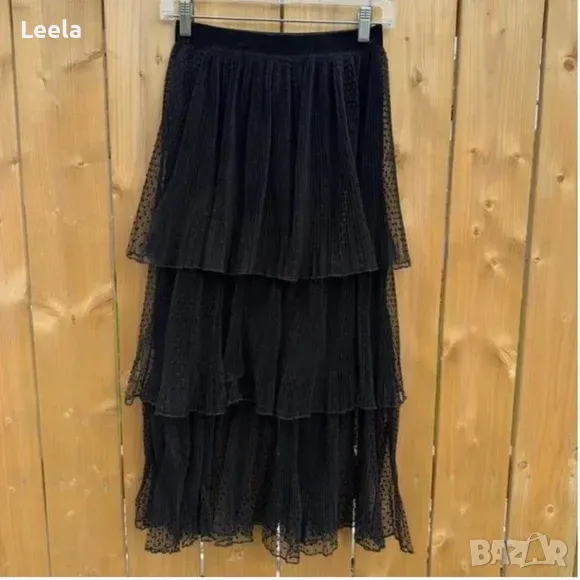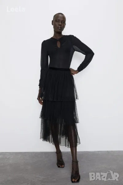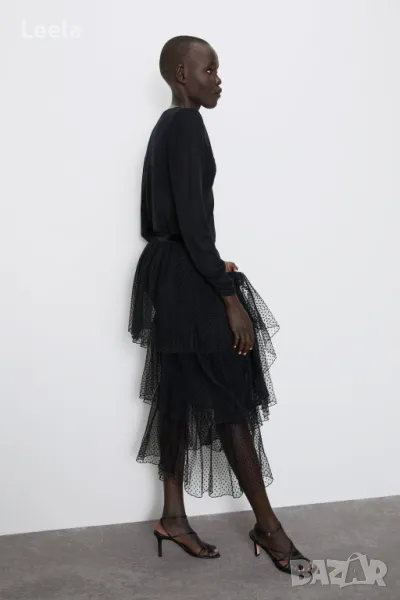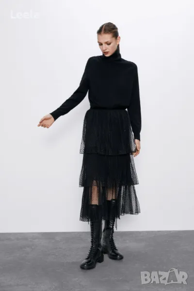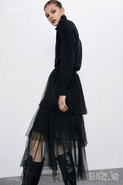 Дамска пола Zara на етажи от ефирен черен плисиран тюл на малки точици, с висока еластична талия, и лека черна подплата.