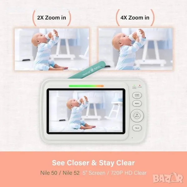 Бебефон Heart of Tafiti с камера и аудио, 5-инчов 720P HD Quad View разделен екран, ниска EMF, камери за нощно виждане с панорамно увеличение, без WiFi, VOX/гласово активиране, дълъг живот на батерията, Niles 50. 100% защитена цифрова безжична технология осигурява лична и сигурна връзка между камерата и монитора. Сигналът 2.4Ghz без смущения работи в къщата между стаите на горния/долния етаж. Няма нужда да инсталирате WIFI/Интернет. 【Намаляване на ЕМП, здрави бебета】Изключителната технология за пестене на енергия Tafiti heart може значително да намали магнитните полета, електрическите полета и радио полетата, генерирани от бебефоните, и да ги поддържа под безопасна стойност. 【5-инчов 720P HD разделен / четворен дисплей】5-инчов 720P HD голям екран с висока разделителна способност ви позволява ясно да видите своя ангел, наслаждаващ се на сладки сънища или играещ в стаята. Когато има повече от една камера (до 4 камери), мониторът може да остане свързан с всички камери едновременно, показвайки ги в режим на разделен или четворен изглед. Аудио наблюдението може да остане на една камера или автоматично да превключва между камерите на всеки 10 секунди, за да ви информира за всички камери. 【345° дистанционна камера с панорамно накланяне и 2X/4X увеличение】Мониторът се предлага с камера с панорамно накланяне и мащабиране. С камера за дистанционно управление, която се върти на 345° хоризонтално и 63° вертикално, можете лесно да получите по-широк изглед към стаята на вашето бебе. Функцията за стая 2X/4X също ви позволява да виждате бебето си по-близо и по-ясно. 【Двупосочен разговор и автоматично инфрачервено нощно виждане】: С бутона TALK Back можете да говорите с вашия партньор или ангел, когато имат нужда от вас. И автоматичното нощно виждане дава ясни инфрачервени изображения в сивата скала, сигурни, че можете да видите своя ангел не само през деня, но и през нощта!