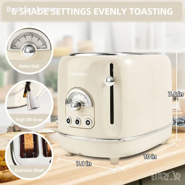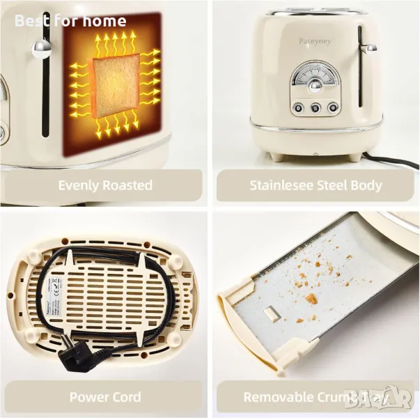 Тостер от неръждаема стомана Pateyney: Тостер от неръждаема стомана Pateyney Тостерът за 2 филийки се предлага с корпус от неръждаема стомана за хранителни цели, нетоксичен, без BPA, безопасен и здравословен. Изпечете бързо и равномерно и бързо охладете. Обвивка и функция против ръжда и прегряване, лесна за почистване и издръжлива.