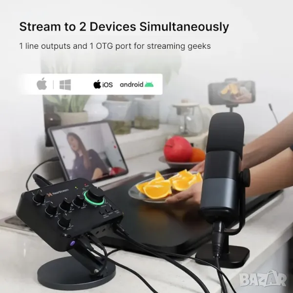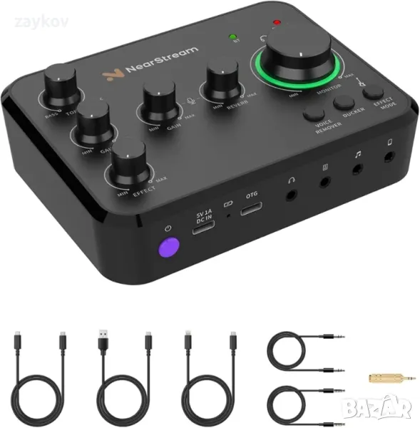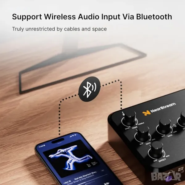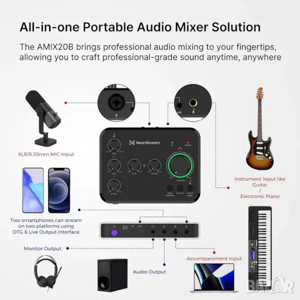 [Силна съвместимост и Bluetooth връзка]: Аудио интерфейсът за запис работи перфектно с компютър, смартфони, таблети и компютри. Без усилие стриймвайте или записвайте с помощта на популярен софтуер като TikTok, Twitch, YouTube, Facebook, OBS Studio. AMIX20B поддържа Bluetooth свързаност под името "NearStream AMIX20B". Използвайте го, за да осигурите музикален съпровод чрез Bluetooth връзка, но имайте предвид, че Bluetooth не поддържа извеждане на звук.