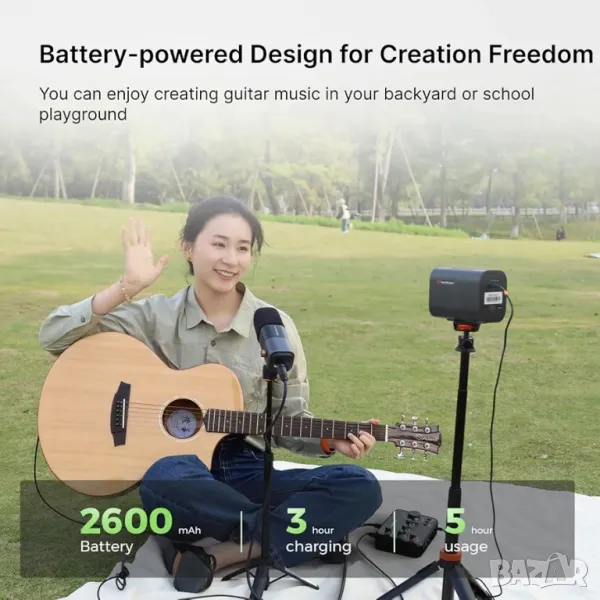 [Идеален за китара, електрическо пиано и други музикални инструменти с 6,35 мм жак]: Аудио интерфейсът за запис на музика поддържа връзка с инструменти като китара и бас. С честотна характеристика от 20Hz до 20kHz, аудио интерфейсът на китарата осигурява ясен и точен звук от инструмента. Можете също така да регулирате тона, усилването и ефектите на инструмента чрез въртящите се копчета, осигурявайки оптимален звук.