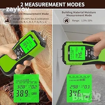 ✔️LCD дисплей с подсветка и лесен за използване: Цифровият детектор за влага използва голям LCD дисплей с подсветка в ярко зелена светлина за лесно отчитане. Текущата измерена стойност може да се задържи на дисплея чрез кратко натискане на бутона Hold. Освен това има функция за памет, която може да запише 20 групи от данни. Интегрираната околна температура може да бъде измерена и показана в °C или °F. И влагомерът ще се изключи автоматично след 3 минути без работа, за да пести батерията.