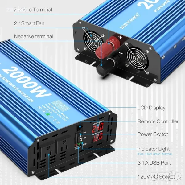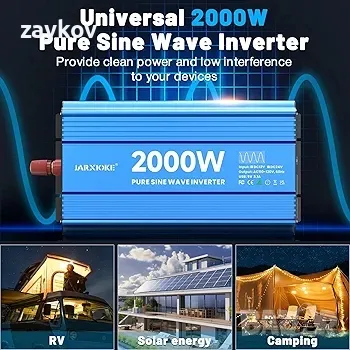 Инвертор JARXIOKE осигурява истински 2000 W непрекъсната и 4000 W пикова мощност. 12V до 110/120VAC чиста синусоидална технология осигурява висока ефективност на преобразуване (>90%) и ниски загуби на празен ход за по-големи икономии на енергия.☀[Удължен живот на инвертора] Дизайн на изолация на входа/изхода и технология за плавен старт, голям издръжлив алуминиев корпус осигурява усъвършенствана защита срещу изпускане и удари. Интелигентните охлаждащи вентилатори помагат за намаляване на топлината и предотвратяват късо съединение.☀ [Защита] Пълна защита за безопасност: пренапрежение, под напрежение, претоварване, късо съединение, прегряване, защита срещу обратна полярност (предпазител). Функция за автоматично нулиране и защита от изтичане (мълния). Отговорността за продукта се поема от AIG.Многофункционален: 2 AC контакта и 1 3,4 Amp USB порт за захранване на игрови конзоли, прахосмукачки за автомобили, камери, телевизори, телефони, хладилници и др. Използвайте при извънредни ситуации, урагани, бури, снежни бури и прекъсвания на електрозахранването, където е необходимо променливотоково захранване.