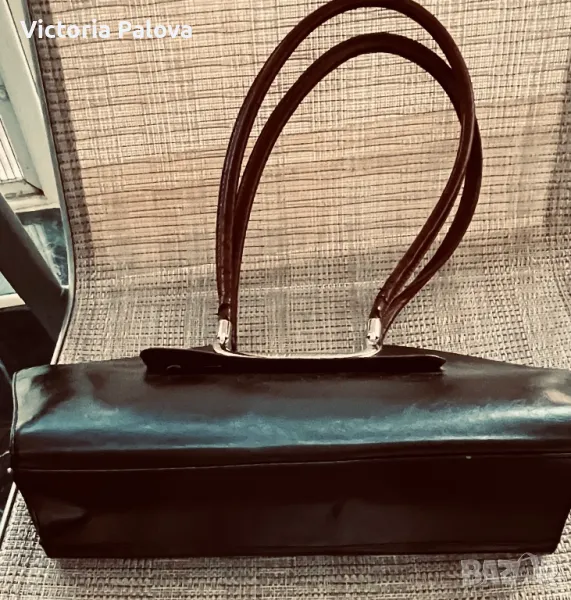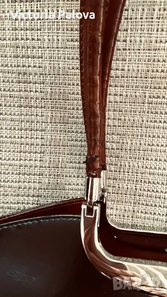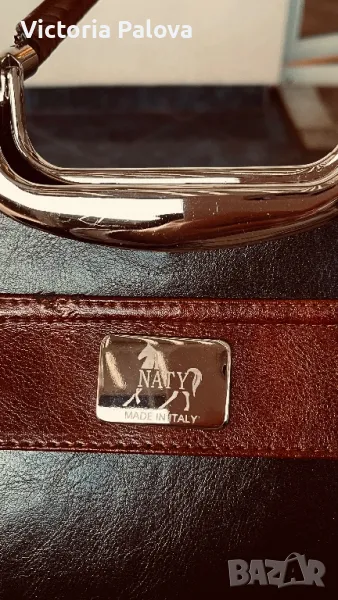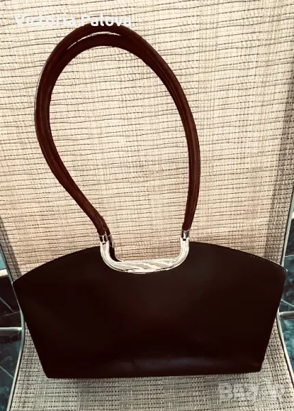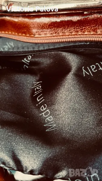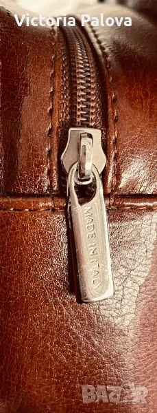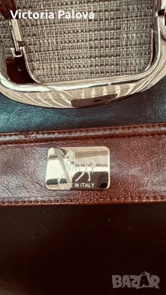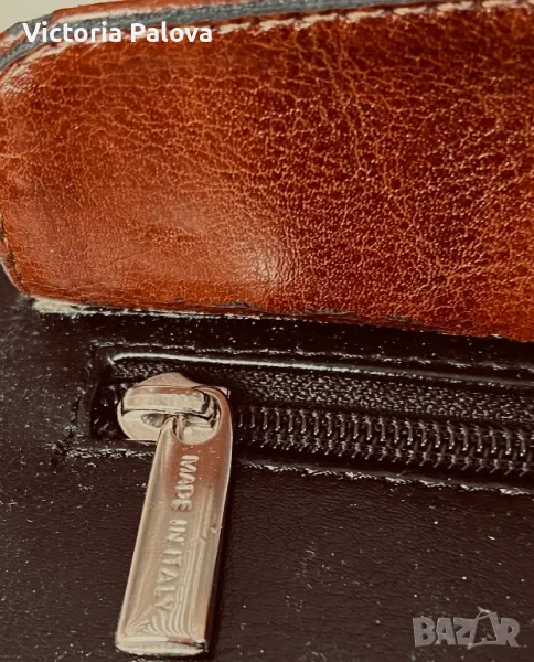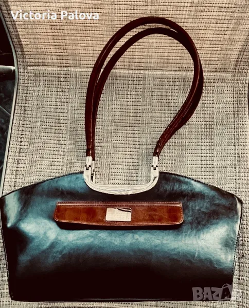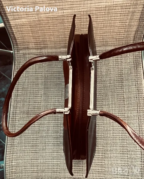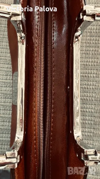 Много красива чанта с твърди удобни дръжки - 54см, дъното - 31см на 8см, височина - 21см, горе широчината е 41см. Вътре е с два джоба с ципове и един малък без цип. От външна страна има още един джоб с цип. Чантата е гладка и твърда, с много красиви лъскави метални елементи. Чантата има напукана кожа на места, показано е на снимки,не се забелязва много, цената е съобразена с това.