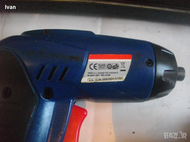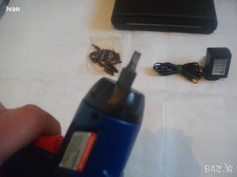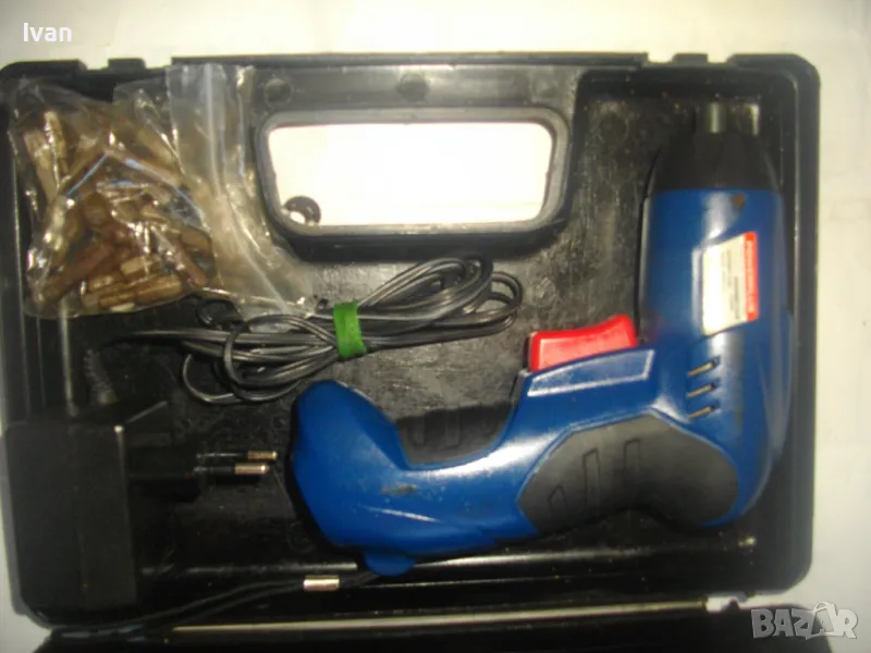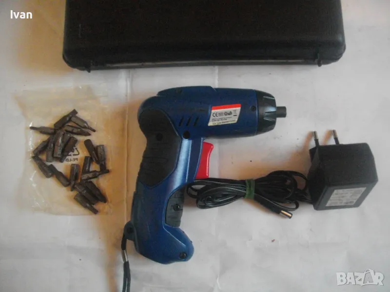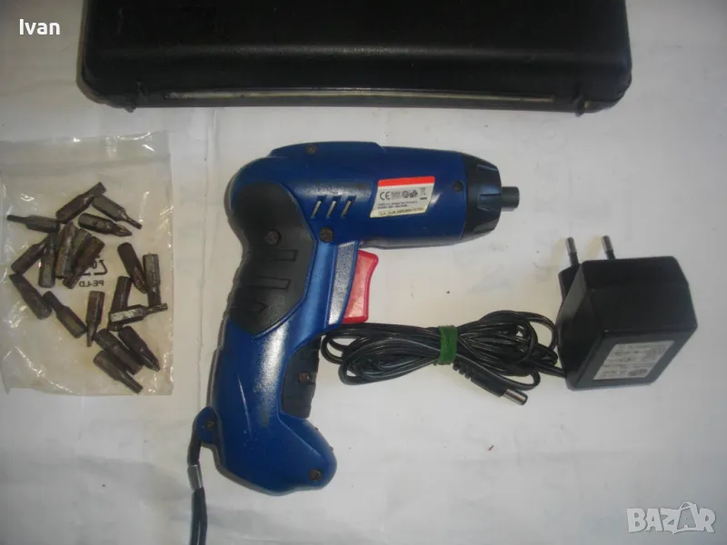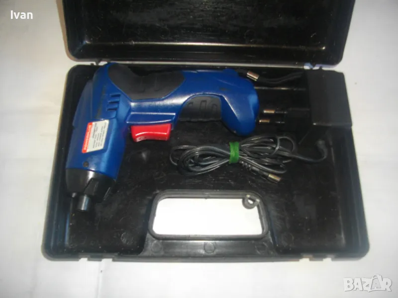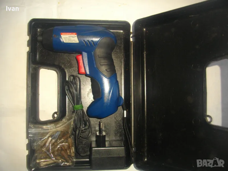 ОПИСАНИЕ на 3,6 волтов акумулаторен мини винтоверт за работа в труднодостъпни места, оригинален белгийски на Поуър Плюс, в комплект с куфар, зарядно и торбичка с накрайници - цена 89 лв. Описание на белгийски 3,6 волта с куфар - 89 лв-син, марка Power Plus Машината е като нова, с много запазен външен вид и отлично работно състояние, с отлична литий-йонна батерия. Производство - оригинално Белгия, вписано на маркировките. Марка и модел-Power Plus POWS ET7CS. Мощност 3,6 волта, 180 оборота в мин.. Батерия много добра, държи силен заряд дълго време-600 милиампера. Опция просветка лед фенер. Светлинна индикация при зареждане. За накраиници с диаметър 6 мм.Гумирана нехлъзгаща се дръжка.Зарядно-4,5 волта,350 милиампера. Оригинална торбичка с много различни накрайници тип битове за винтоверта. Винтоверта със зарядното и накрайниците е прибран в твърд пластмасов куфар-12х12 см.