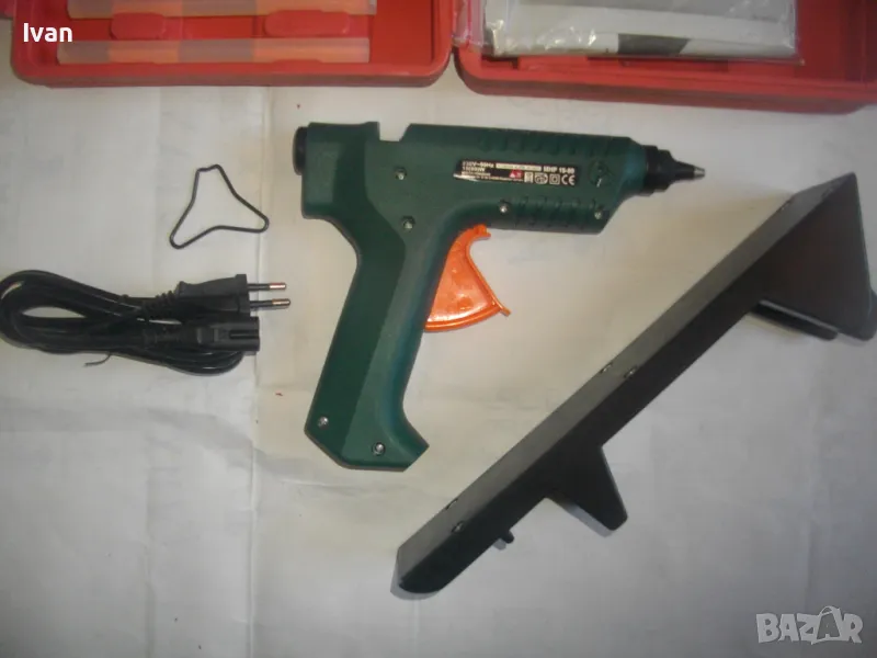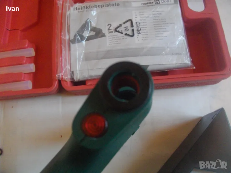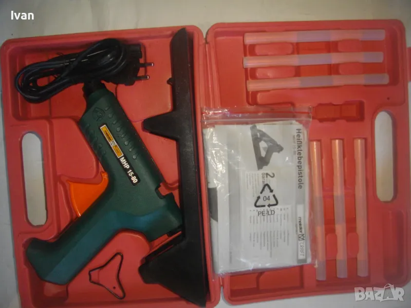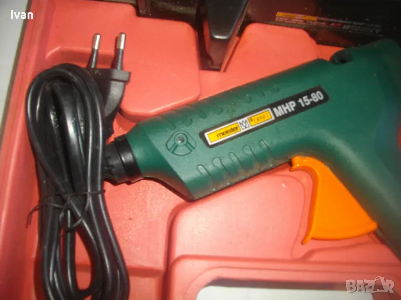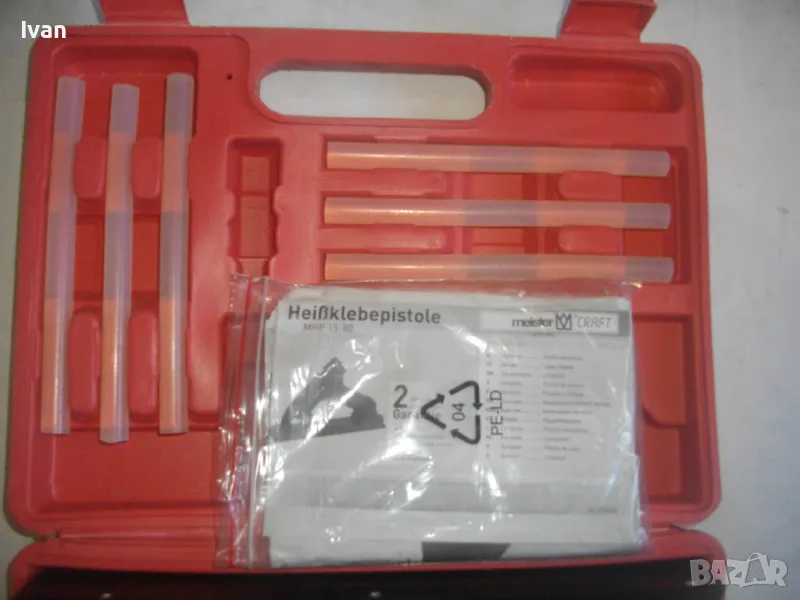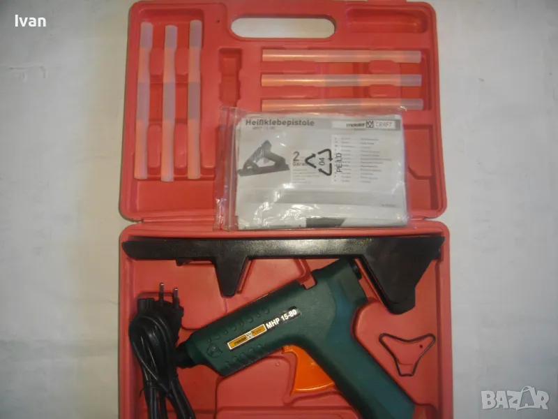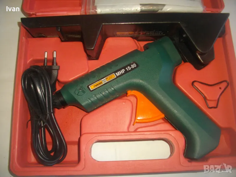 ОПИСАНИЕ на нов немски уред Meister за топло лепене и фиксиране чрез пръчки силикон пълен комплект в червен куфар - цена 119 лв. Съвсев нов, неизползван и неупотребяван електрически пистолет за топло/горещо лепене и точно фиксиране чрез силикон, професионален оригинален немски модел на Мейстер от преди години, от старото немско качество.