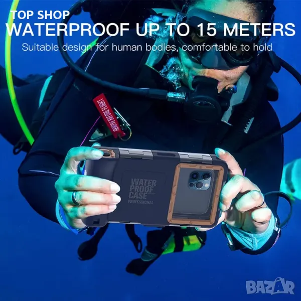 Подобрен калъф за гмуркане 15M/50FT, който значително подобрява водоустойчивостта и устойчивостта на натиск на водоустойчивия калъф за телефон. Отличен водоустойчив корпус за водни и подводни снимки и видеоклипове, идеален за гмуркане, сърф, гмуркане с шнорхел, ски,