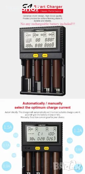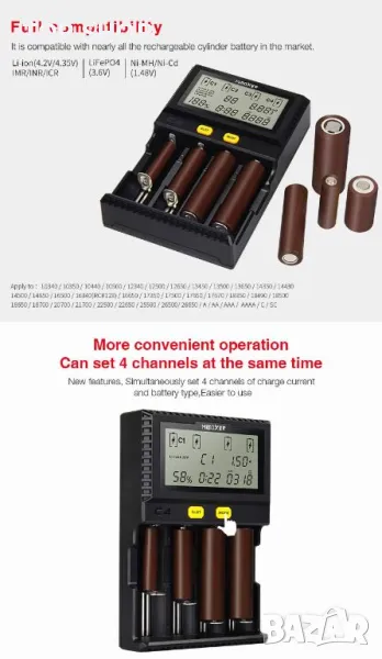 Това интелигентно зарядно устройство е съвместимо с почти всички видове акумулаторни батерии като Li-Ion, IMR, INR, ICR, Ni-MH, Ni-Cd.