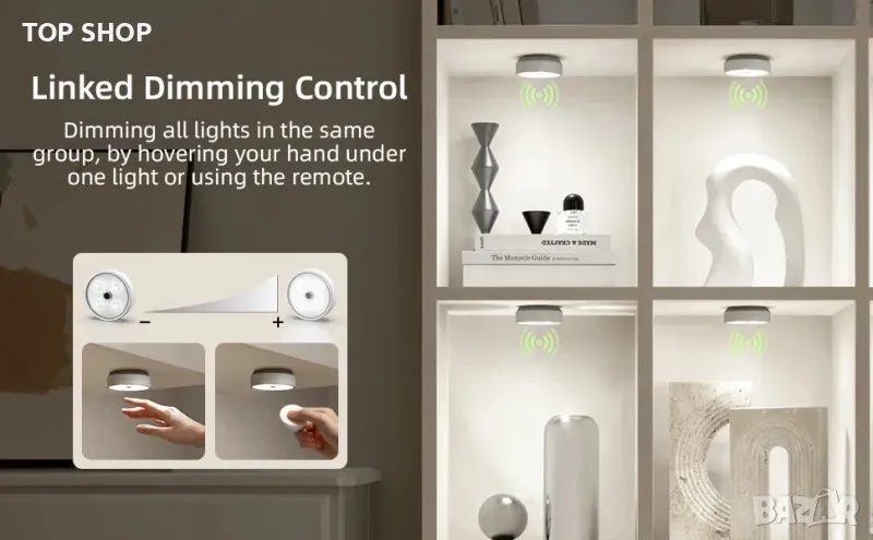 2 начина за управление - EZVALO Puck Lights с дистанционно управление могат да бъдат разпределени в 2 групи за отделно управление. С едно просто докосване на ръката (в рамките на 3 см) или с помощта на дистанционното управление, всички LED светлини в една и съща група могат да се регулират и включват/изключват едновременно, без да е необходимо да докосвате всяка лампа на шкафа поотделно